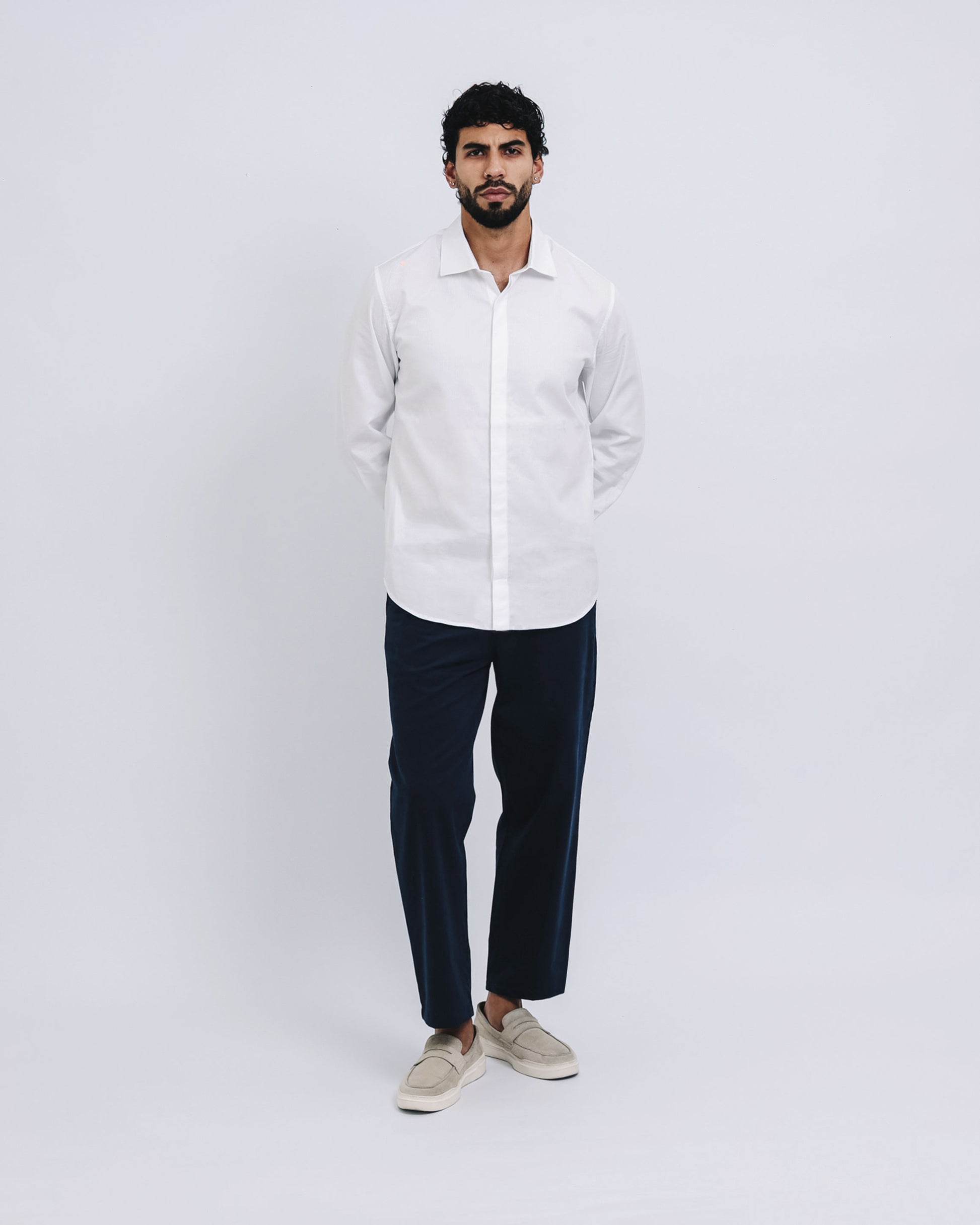 Camisa manga larga confeccionada en algodón. Cuello estilo cutaway con botones ocultos en una fina pechera con tapeta francesa. Fit slim, con pinzas en espalda. Detalle de cinta a contraste en pie de cuello y puños.