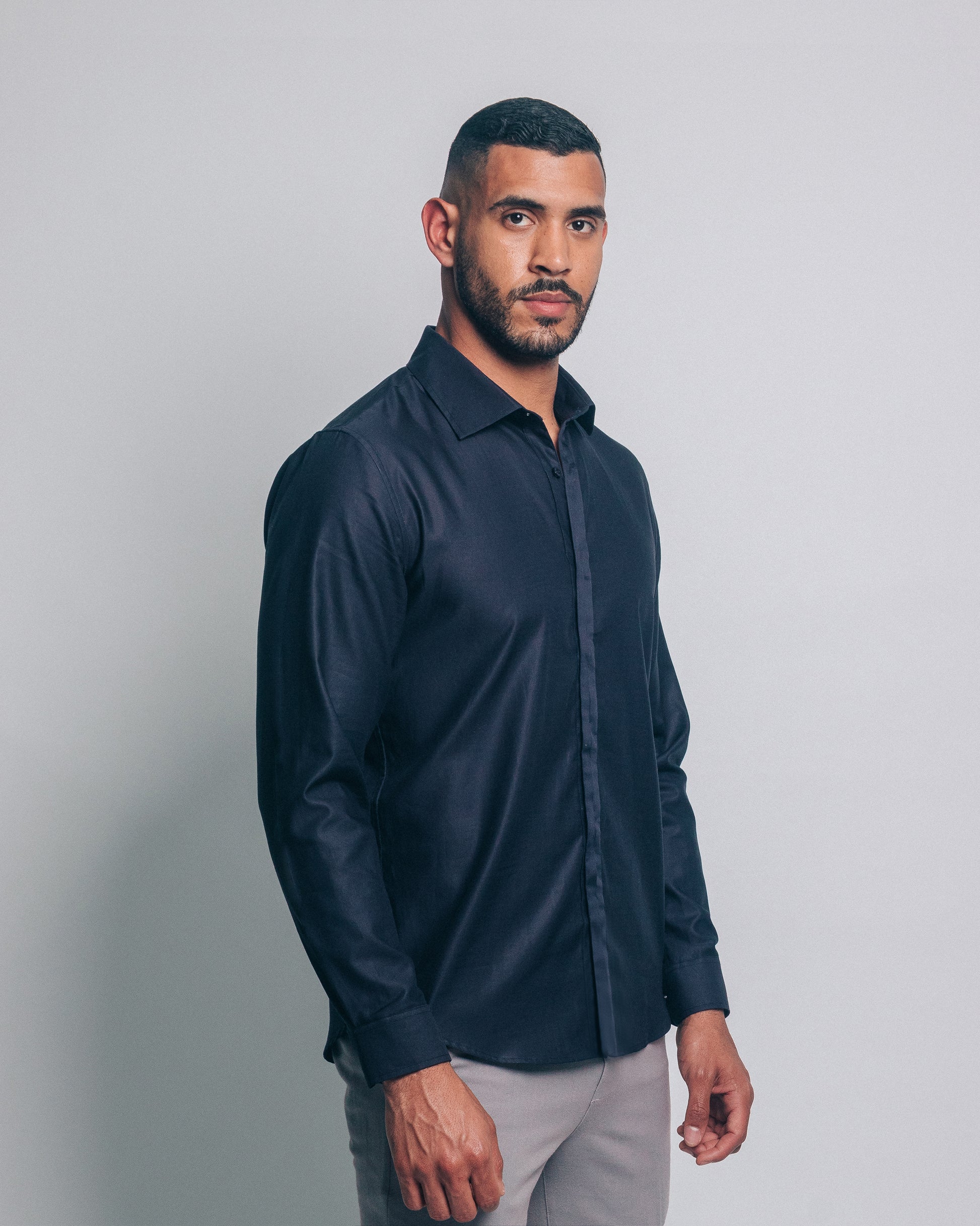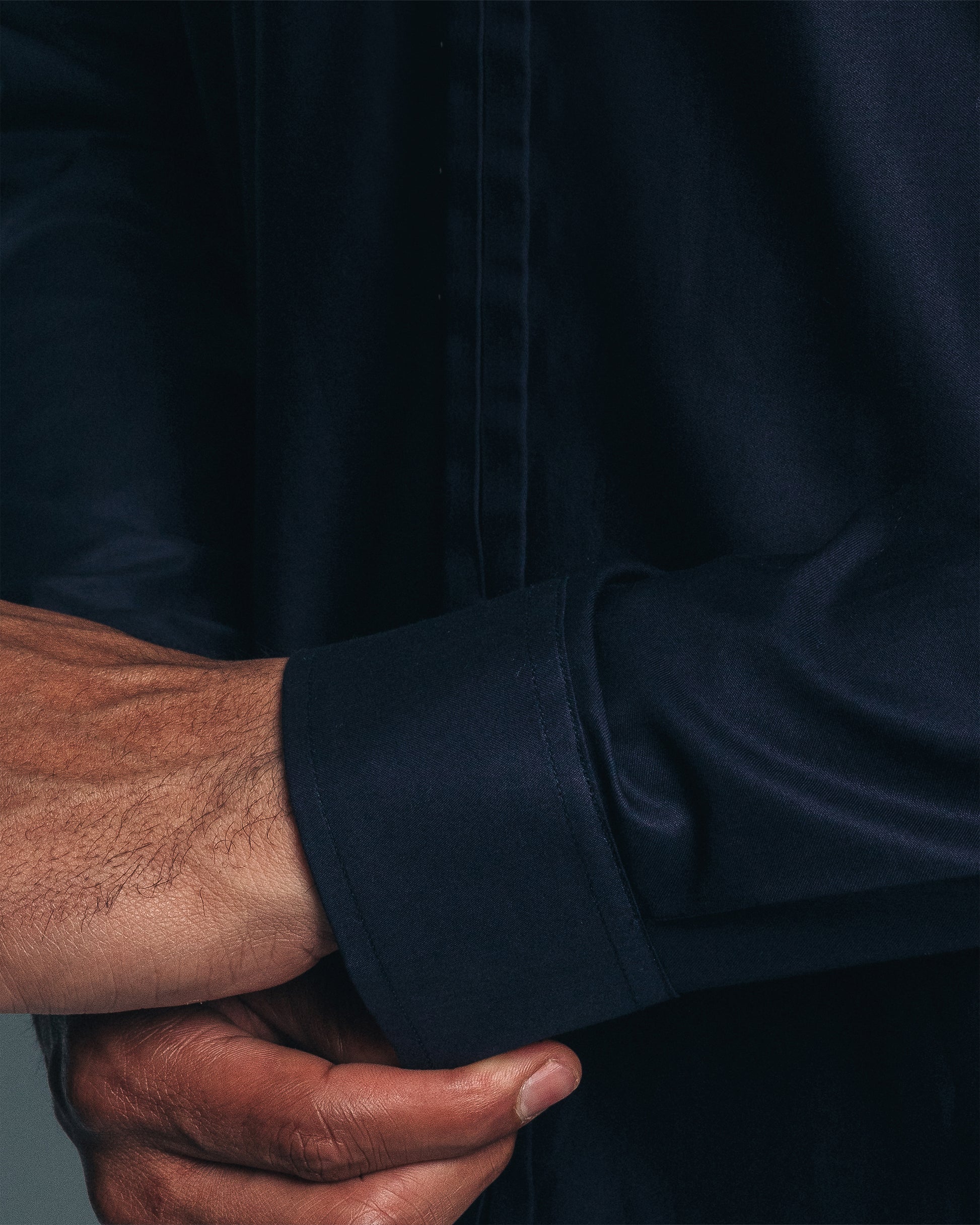 Camisa manga larga confeccionada en satín, 100% algodón. Pinzas en la espalda, fit slim. Detalle de cinta en pie de cuello y mangas. Cerradura frontal con botones a juego ocultos por la pechera.